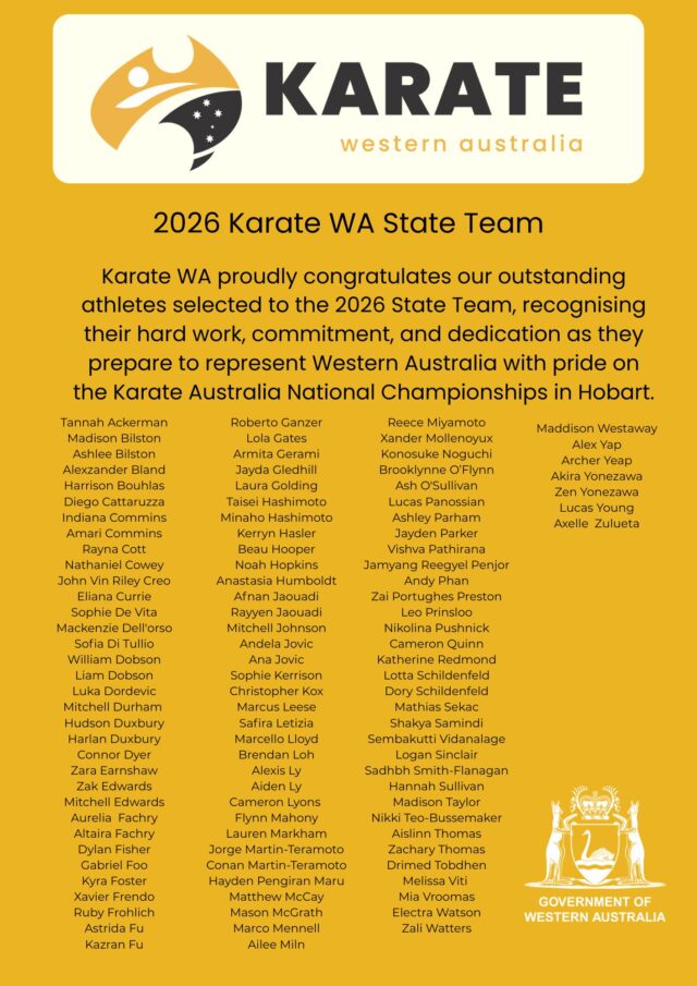 Karate WA proudly congratulates our outstanding athletes selected to the 2026 State Team, recognising their hard work, commitment, and dedication as they prepare to represent Western Australia with pride on the Karate Australia National Championships in Hobart.