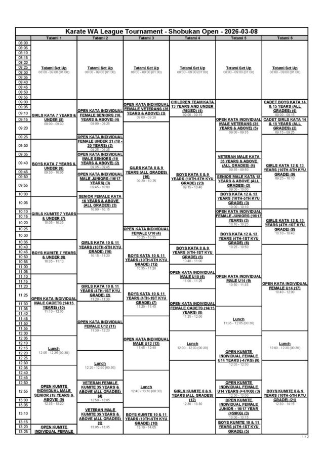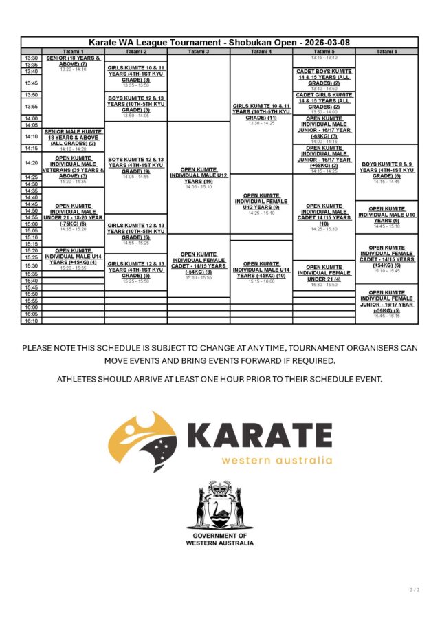 Please find attached the schedule for this Sunday’s Karate WA League – Shobukan Open. Please check the schedule carefully and allow at least 1 hour for warm up time, please note the schedule is subject to change and the tournament organiser can move events and run events prior to the scheduled start time.